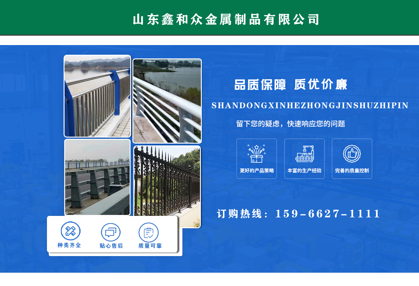 山東鑫和眾金屬制品有限公司主要產品有防撞護欄,橋梁護欄,道路護欄,河道護欄,不銹鋼護欄等護欄。提供設計方案,一站式定制,包您滿意價格優惠,歡迎來電咨詢! 公司常年從事銷售護欄防撞護欄,橋梁護欄,道路護欄,河道護欄,不銹鋼護欄,橋梁鋼護欄,河道燈光護欄等。產品廣泛應用于橋梁、河道、旅游景區、道路、公路、公園、小區、景觀、道路防撞等領域。 公司產品均采用優質不銹鋼材料,符合相關標準。各種型號不銹鋼復合管及護欄,質量嚴格把控。產品強度高、耐腐蝕、焊接牢固、抗沖擊、性能好,防撞護欄結構簡單、美觀實用大方?! g迎前來訂購!...